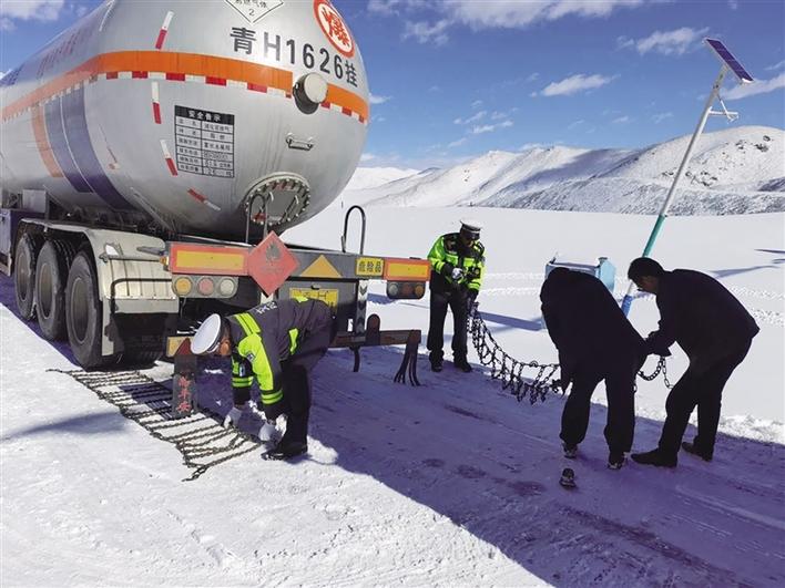 拉萨交警为过往车辆安装防滑链。图由拉萨交警提供