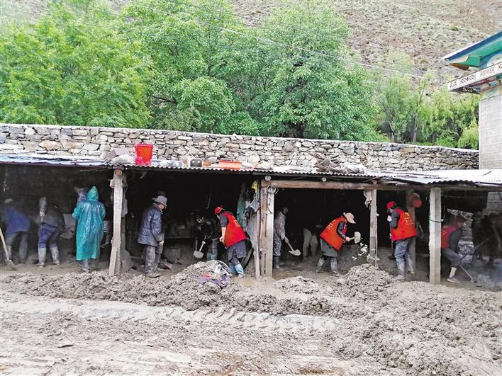 近年来,滚村大力开展人居环境整治,使村容村貌不断改善,群众幸福感不断提升。 图为林芝市朗县滚村“两委”、驻村工作队组织村民开展清理淤泥活动。 记者 史金茹 摄