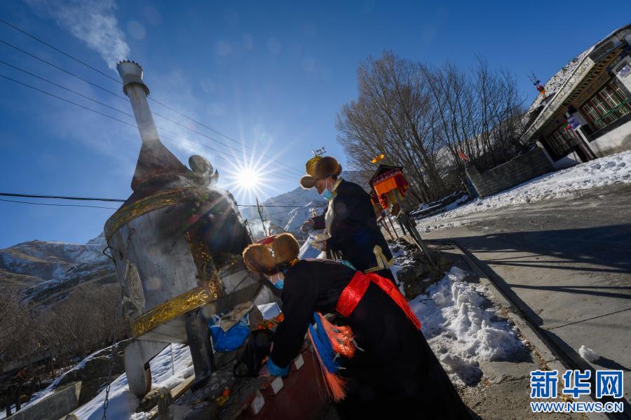 2月12日,在西藏自治区山南市乃东区泽当镇,格央和父母一起,在藏历新年第一天转山祈福。这是格央(前)和父亲一起煨桑。新华社记者 刘金海 摄