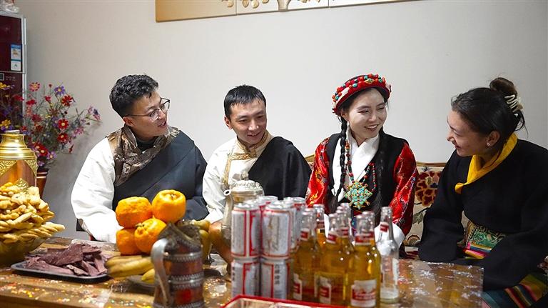 张小彬来自河南,因朋友介绍与次仁央宗结缘。今年是他第4次在拉萨过藏历新年。张小彬说:“藏历新年是藏族同胞最重要的节日之一,老婆早早就开始准备了。家中的桌上早已摆满了藏历新年的传统美食,切玛盒里盛满了糌粑,酥油茶香气四溢。牦牛肉干、奶渣、卡赛、酥油、人参果等也是必不可少的,如今家里显得十分喜庆热闹。”