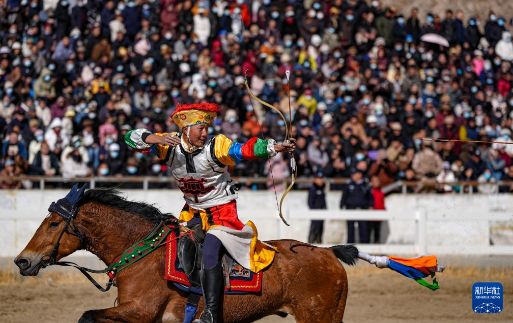 3月2日,马术队员在表演传统马术项目马上射箭。新华社记者 晋美多吉 摄