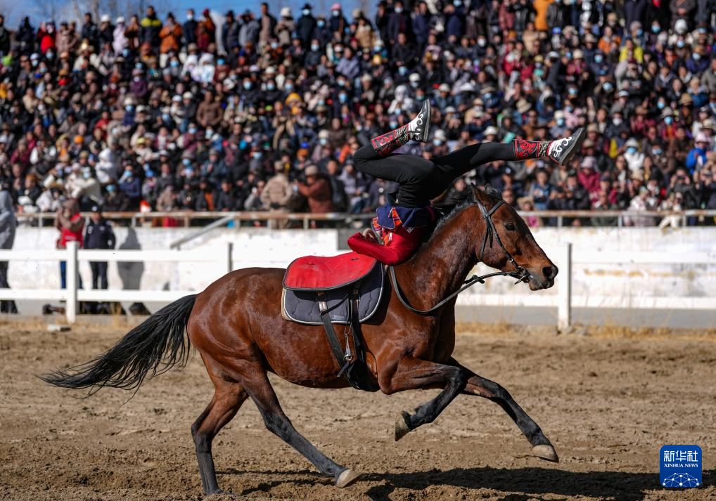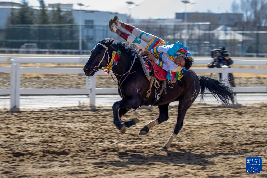 3月2日,马术队员在表演传统马术项目捡碗。新华社记者 晋美多吉 摄