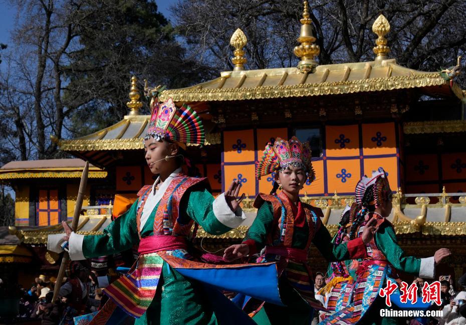 2月28日是2025年藏历木蛇新年的第一天,市民游客在拉萨市罗布林卡内吃切玛、写对联、看藏戏,欢度藏历木蛇新年。图为少儿藏戏《朗萨雯波》演出现场。中新社记者 李林 摄