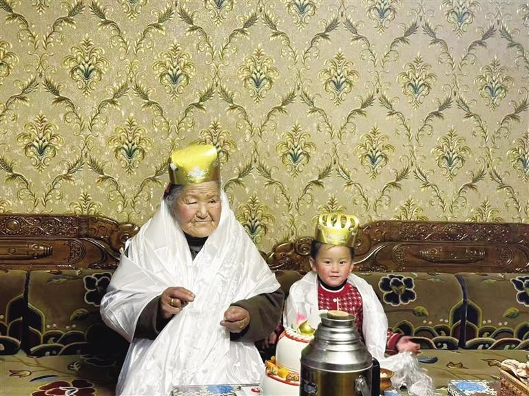 寿宴上,三岁的重孙女格桑举着银制酒壶向太奶奶敬酒献哈达,并祝福奶奶:“莫啦 ‘冲卡’扎西德勒!”看着重孙女踮脚为她敬献哈达,奶奶浑浊的眼里忽然滚落两颗泪珠。