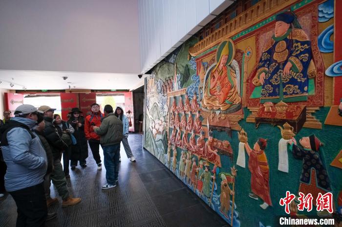 3月18日,游客在布达拉宫珍宝馆参观五世达赖喇嘛到北京觐见顺治皇帝的浮雕。中新社记者 江飞波 摄