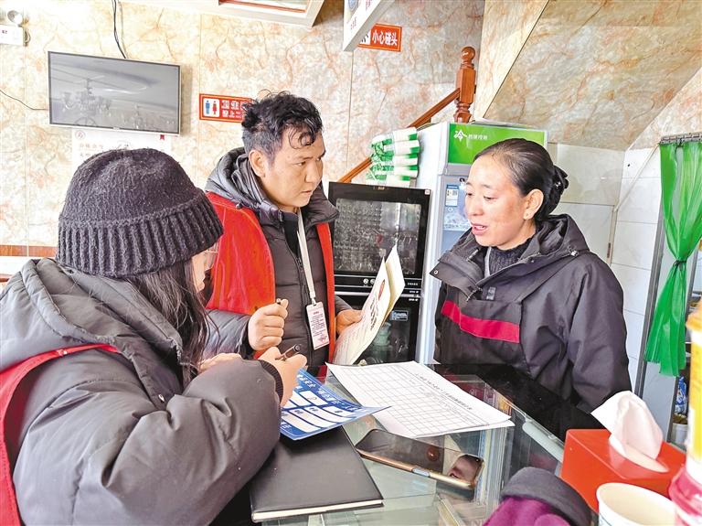 拉萨市城关区八一街道当热社区组织开展食品安全隐患排查工作。这是工作人员在仔细检查商户营业执照、食品卫生许可证和健康证等持证情况。 记者 王敏 摄