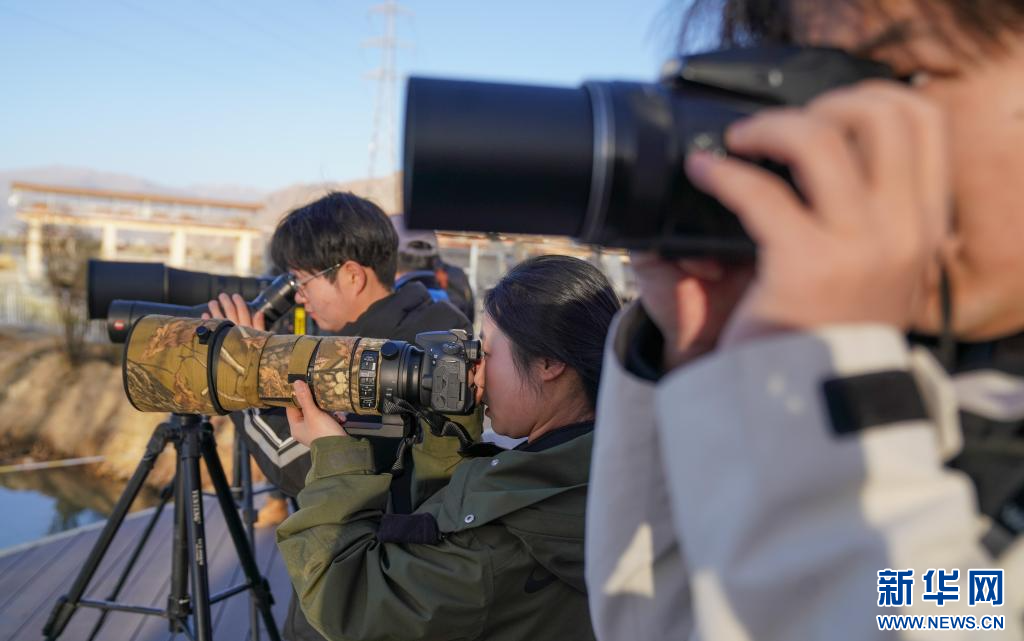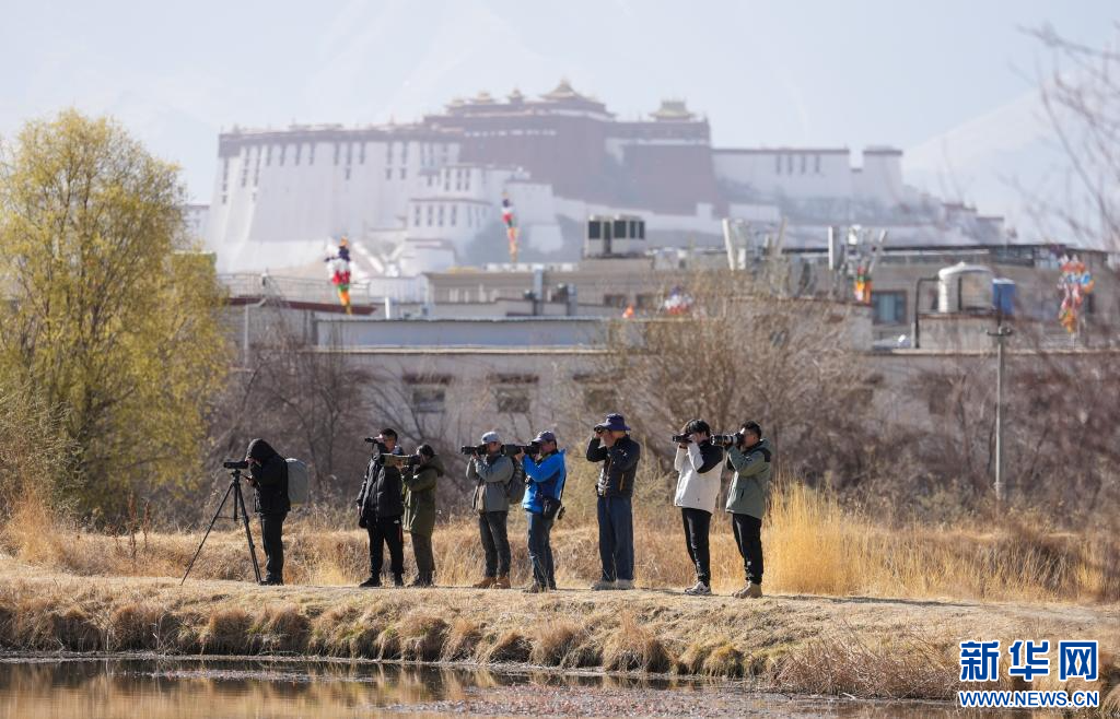 3月29日,参加采风活动的成员在拉鲁湿地观鸟拍照。(新华社记者 晋美多吉 摄)