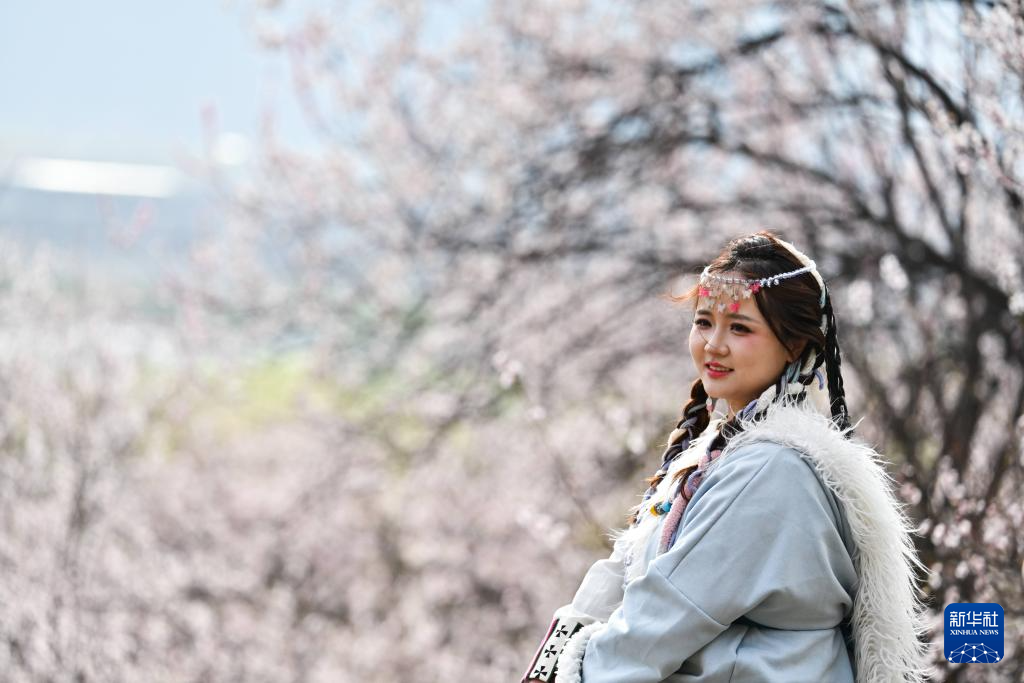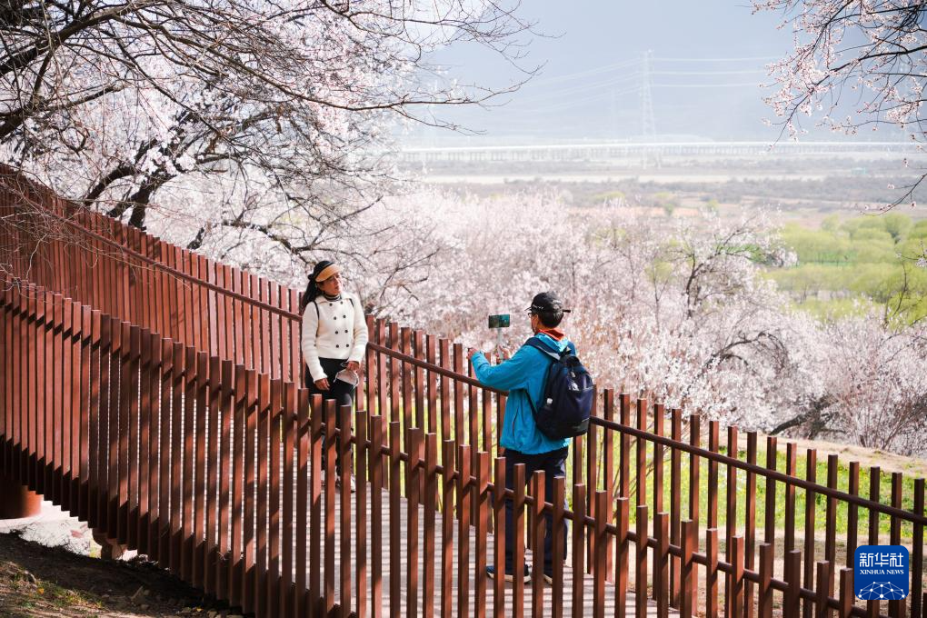 3月29日,游客在林芝市巴宜区嘎拉村赏花拍照。新华社记者 齐芷玥 摄