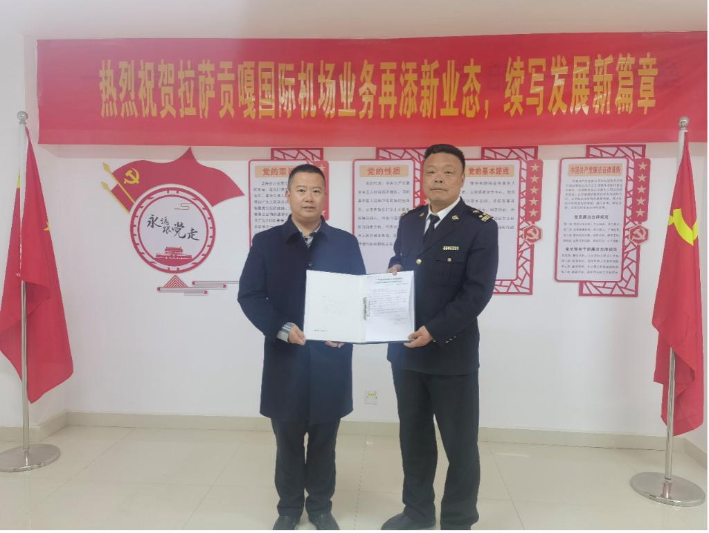 3日,拉萨海关负责人向西藏机场集团货运部负责人颁发海关监管货物仓储企业注册登记证书。(拉萨海关供图)