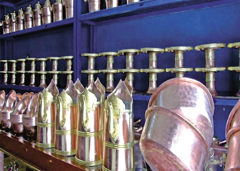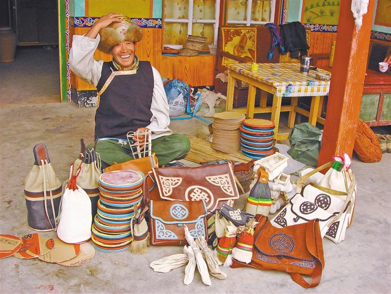 手艺人展示县级非物质文化遗产俊巴皮雕作品 。