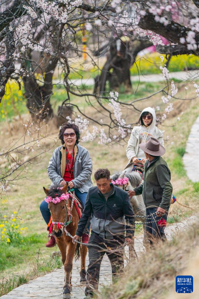 4月2日,游客在林芝市嘎拉村体验马背观花。新华社记者 丁增尼达 摄