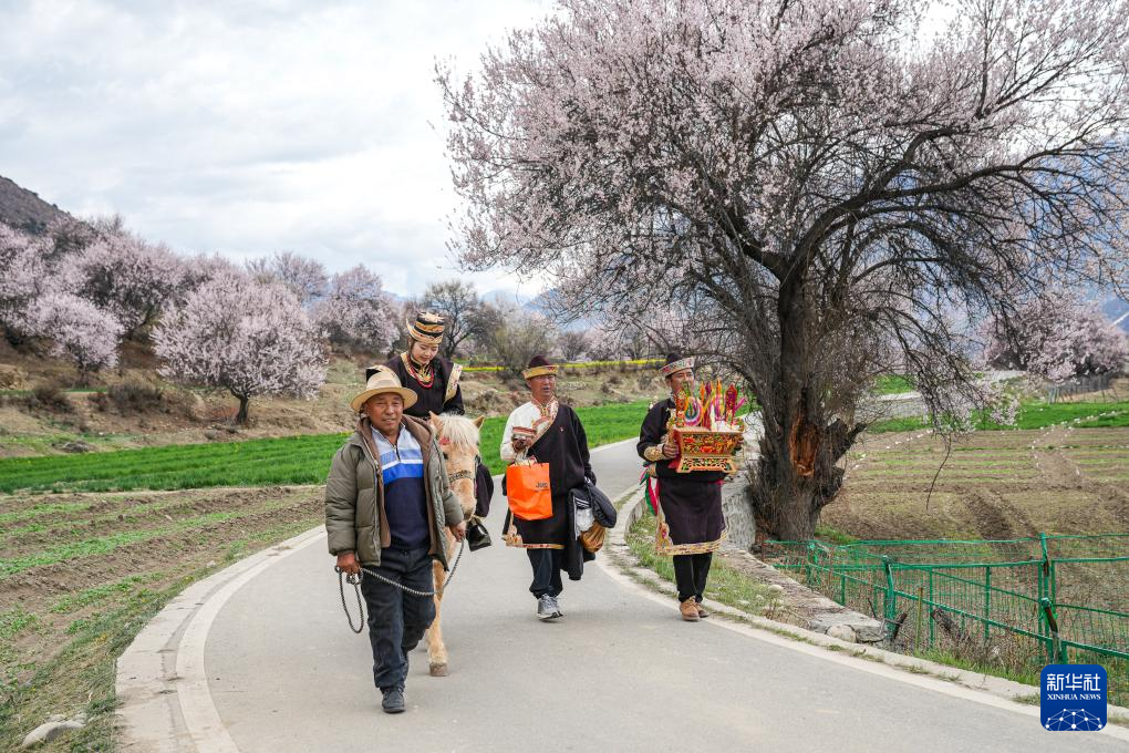 4月3日,林芝市朵当村群众身着盛装、手捧切玛为游客提供民俗体验活动。新华社记者 丁增尼达 摄