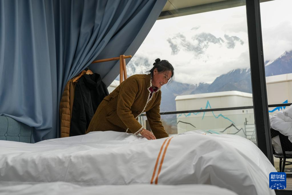4月4日,林芝索松村一家民宿的服务员在整理房间。新华社记者 晋美多吉 摄