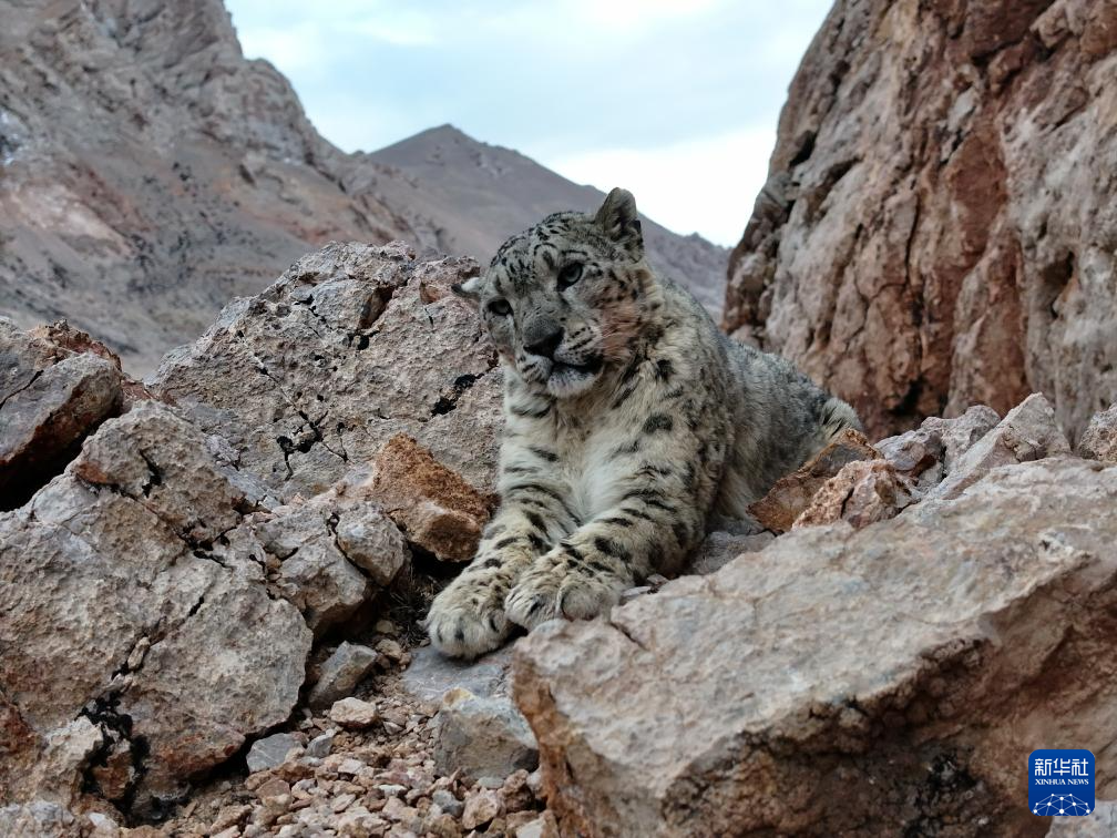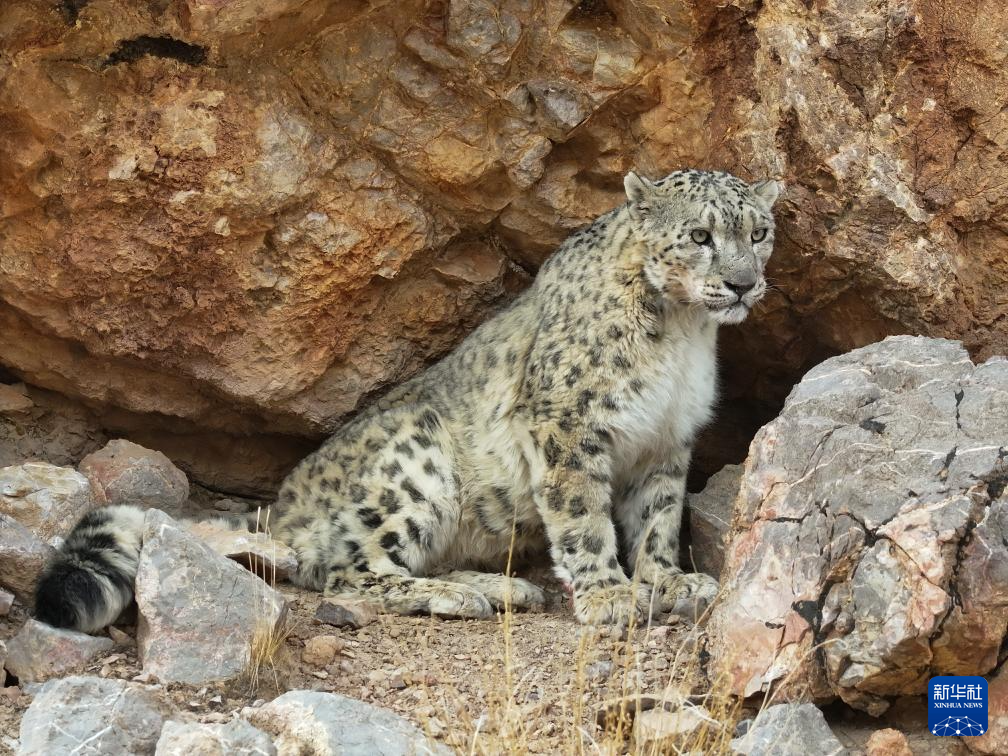 西藏阿里改则县改则镇玉多村附近岩山区域拍摄到的国家一级保护动物雪豹(4月18日摄)。新华社发(索朗仁青 摄)