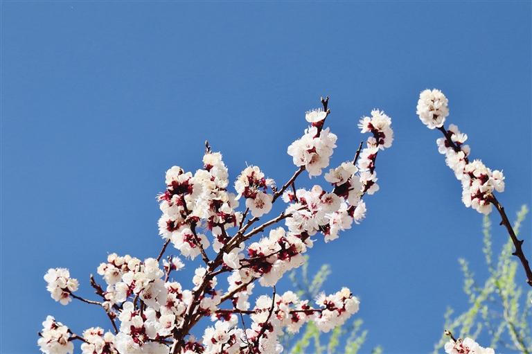路边的榆叶梅率先吐蕊,粉白的花朵簇拥在枝头,远看如粉白的云朵飘浮在街道两侧。沿着道路慢慢走,几株桃树穿插在其中,深红浅粉交错,以蓝天为背景,举起手机随手一拍都是高清壁纸级别的美景。阳光正好时,能看到在花树下晒太阳的老奶奶,她们为这浪漫的春日景色增添了一丝生活的气息。