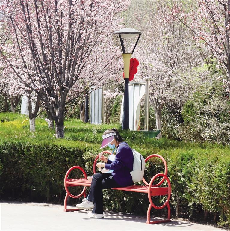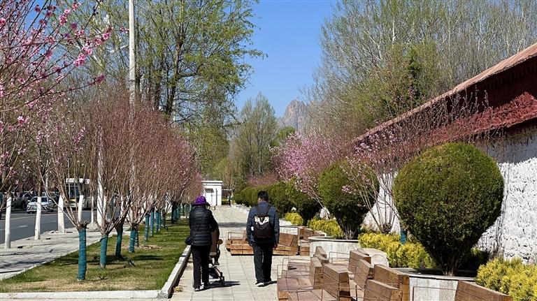 春日的拉萨,从不缺漫步晒太阳、赏花的路线。城北的街道,早已披上了春日的花衣。娘热北路、慈松塘中路、慈松塘东路一带,马路两侧的花木被春季染上新的碧绿与粉红,就连公交车站都被花朵装点得格外浪漫。