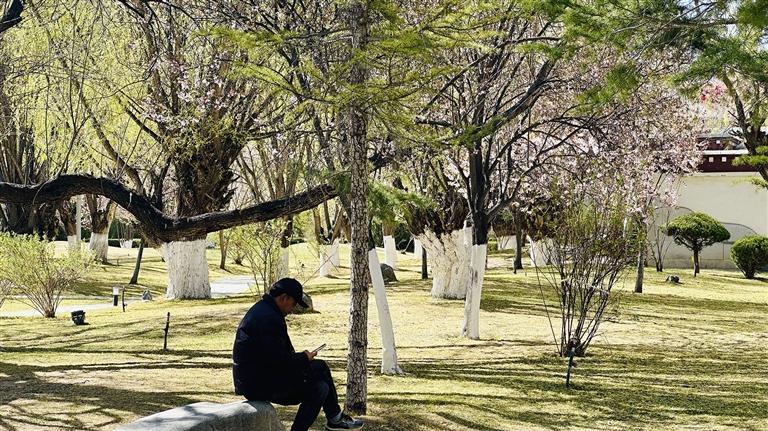 在拉萨,赏花从不必刻意寻找景区,许多街道便藏着盎然春色。四月的拉萨城西,也有着令人目不暇接的美好。八一路、罗堆西路、罗布林卡路一带,除了常见的榆叶梅、紫叶李等,还藏着拉萨不常见的海棠花,此时的海棠花在绿叶的衬托下开得正艳。阳光洒下,花朵和叶子的颜色饱和度极高,微风拂过,花瓣轻柔飘落,不少路人纷纷停下拍照,将明艳的春色收进自己的手机。