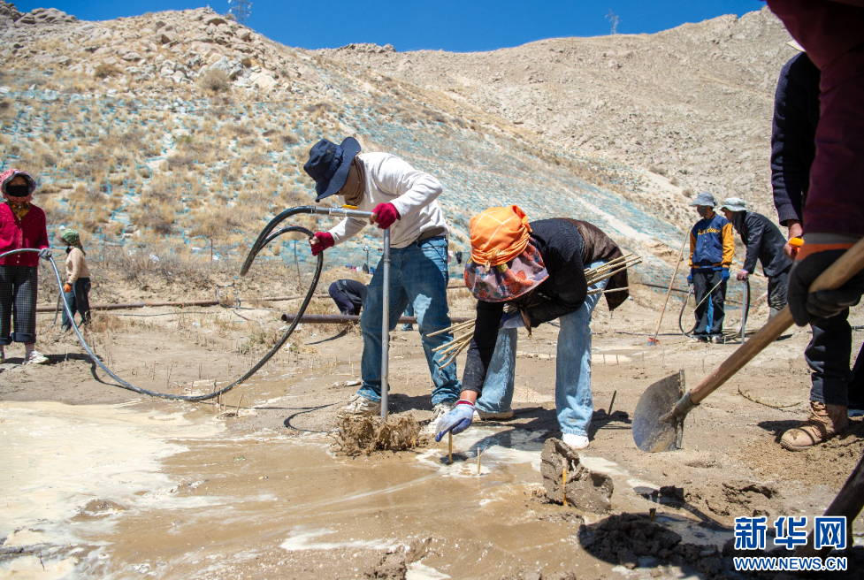 4月24日,在拉萨南北山造林绿化(贡嘎段)西藏森拓雅公司造林片区,当地村民在栽树。新华网 旦增努布 摄