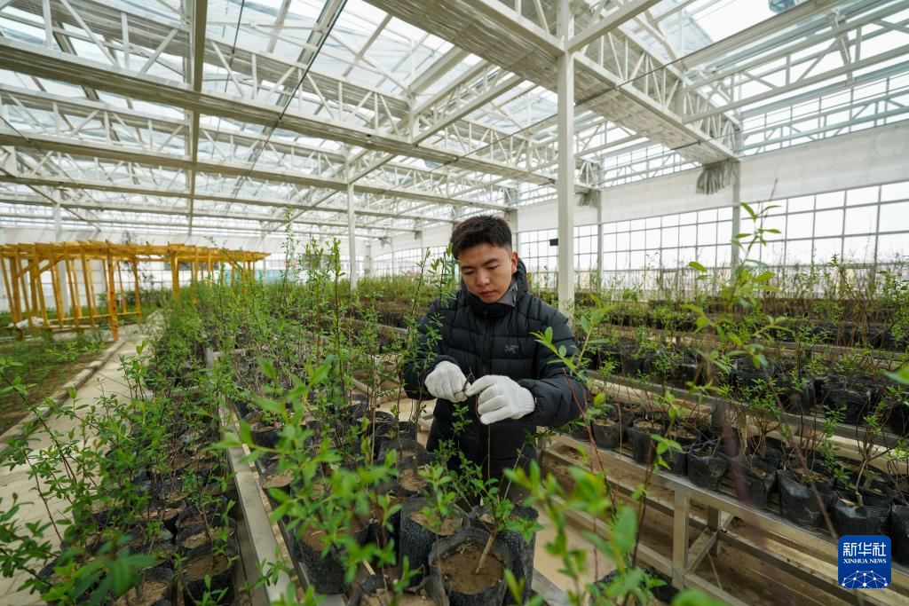 2025年4月25日,那曲市林业和草原局工作人员在那曲高寒高海拔乡土树种培育基地给树苗剪枝。新华社记者 晋美多吉 摄