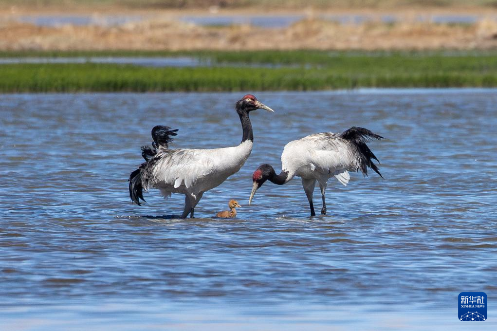 2024年6月9日,一对黑颈鹤带着雏鸟在西藏那曲市申扎县一处湿地栖息、觅食。新华社记者 旦增尼玛曲珠 摄