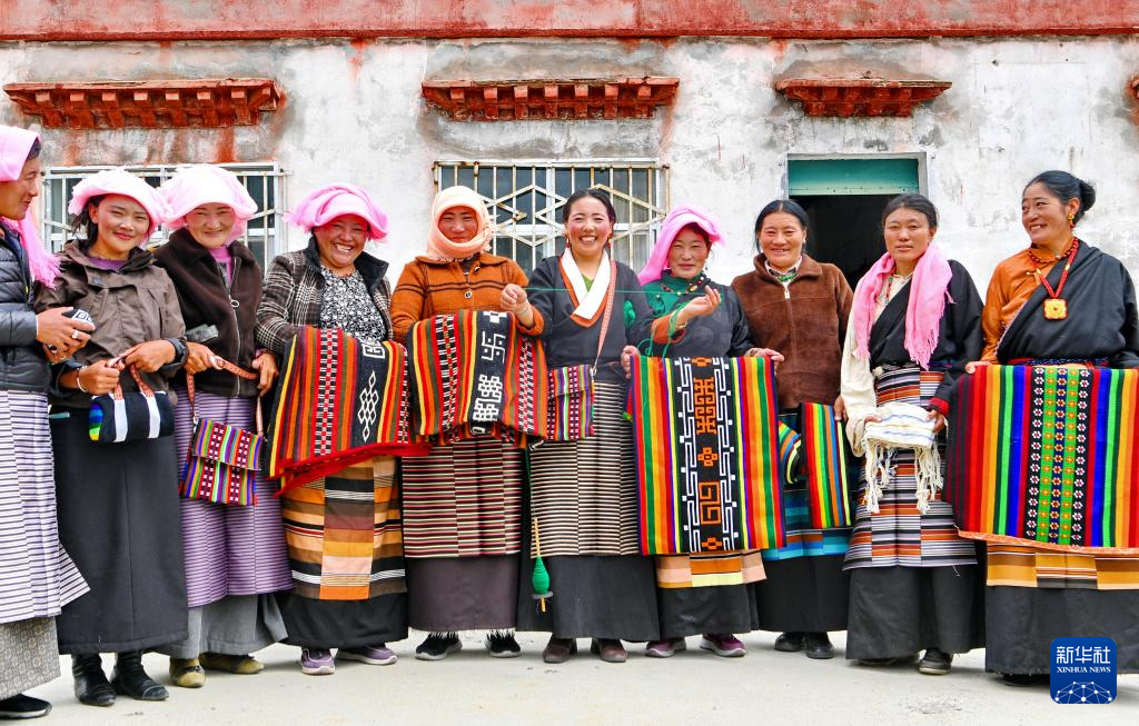 在海拔4000米以上的西藏那曲市色尼区木托村,妇委会主任措吉卓嘎(右五)和合作社成员展示部分编织产品。新华社记者 张汝锋 摄