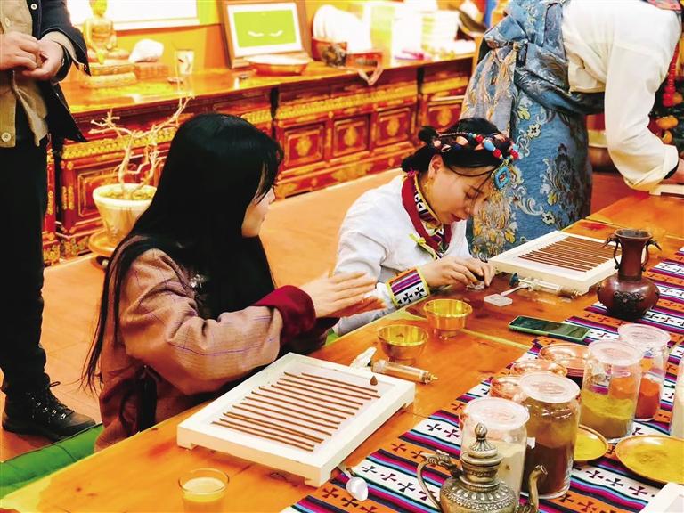 体验制作藏香的游客。