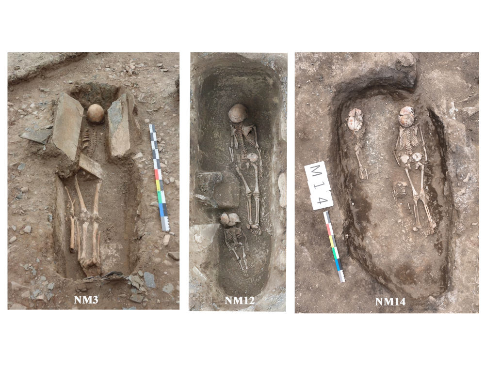 玛不错第一期遗址(距今4500-4000年)墓葬中俯身直肢石棺墓和土坑墓(资料照片)。新华社发(西藏自治区文物保护研究所供图)