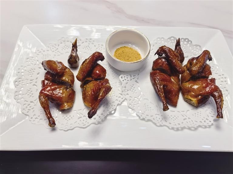 除了闽菜,会馆还推出了创新版川菜和地道粤菜。粤菜中最值得品尝的便是店内的招牌菜之一——广式深井烧鹅。深井烧鹅是粤菜的经典烧腊,其皮脆肉嫩、脂香浓郁,琥珀色脆皮淋上焦香的蜜汁,堪称一绝。一口咬下,烧鹅的脆皮在口中“咔嚓”作响,肥瘦相间的鹅肉满口留香,用传统荔枝木或枣木炭烤的烧鹅还能尝出淡淡的烟熏香,配以酸梅酱,解腻开胃,鲜美无比。