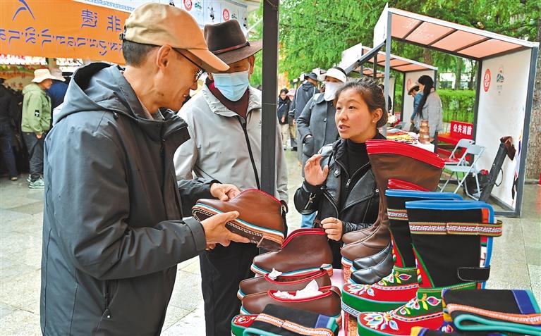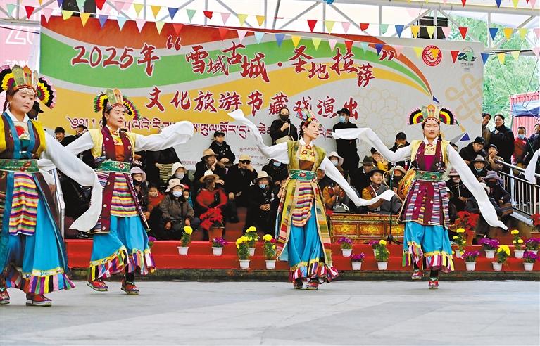 近日,“雪域古城·圣地拉萨”文化旅游节非遗主题活动在拉萨宗角禄康公园内开展,现场人潮涌动。非遗藏戏演员身着华服,以高亢唱腔演绎《朗萨雯蚌》选段,观众围坐沉浸于雪域艺术魅力。非遗展销区陈列着木雕、牛皮制品等传统手工艺品。活动全面展现了非遗保护传承与利用的新进展和新成效。记者 唐斌 摄