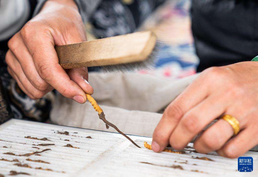 在那曲市索县西昌乡,牧民白嘎在收纳清理好的虫草(5月18日摄)。新华社记者 丁增尼达 摄