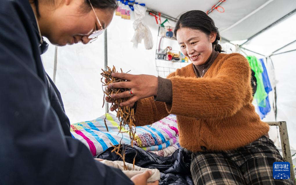 在那曲市索县西昌乡,牧民将清理好的虫草装袋收纳(5月18日摄)。新华社记者 丁增尼达 摄