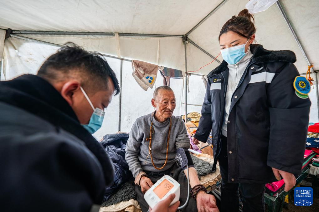 在那曲市索县西昌乡,卫生院医务人员为虫草采集点的牧民测量血压(5月18日摄)。新华社记者 丁增尼达 摄