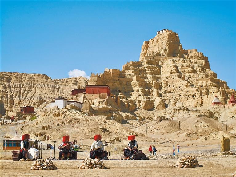 图为5月19日,朵热乐队在札达县古格王国遗址前弹奏民俗乐曲。记者 洛桑旦增 摄