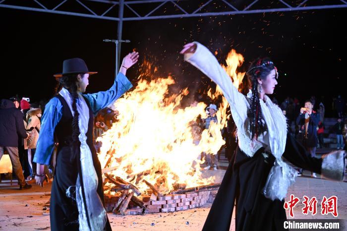 图为游客身着藏族节日盛装参加“情定当雄”篝火锅庄晚会。中新社记者 贡嘎来松 摄