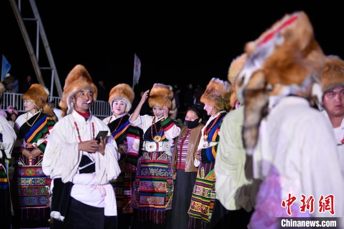 图为“情定当雄”篝火锅庄晚会文艺演出现场。中新社记者 贡嘎来松 摄