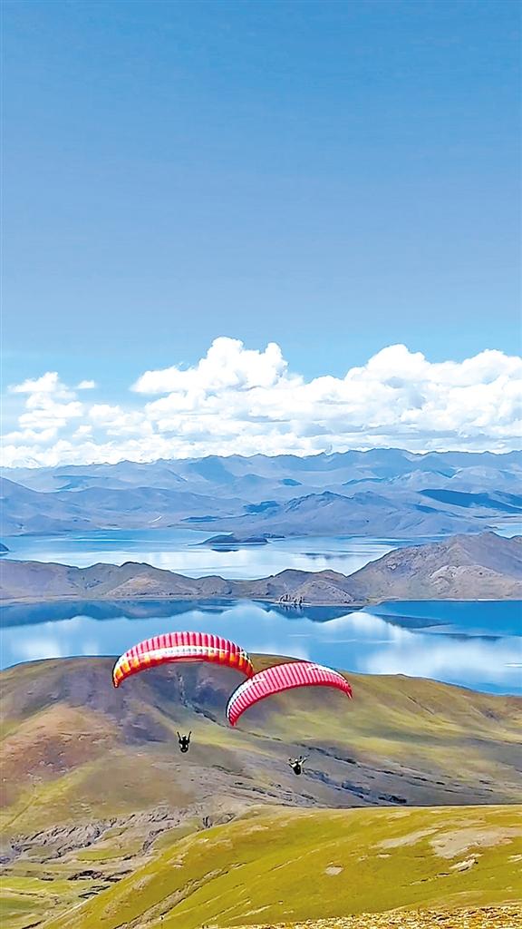 5月,午后的羊卓雍错(以下简称羊湖)别具魅力。在海拔大约5000米的山顶上,经过一番准备,来自深圳的游客朱先生跟随教练口令向悬崖边冲去。滑翔伞被气流托举着腾空而起,划出一道优美的弧线,像雄鹰一样翱翔在波光粼粼的湖面上,最后飘然降落在湖边……