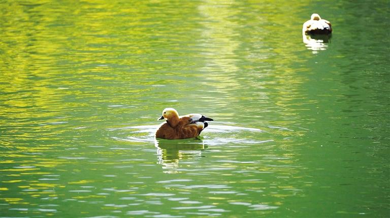 沿着蜿蜒的栈道,向湿地深处走去,清澈的湖水倒映着蓝天、白云,仿佛置身于梦幻般的境界。天空中不时有鸟儿飞过,水中的赤麻鸭自由自在地游来游去,赤麻鸭宝宝排成“一”字队形,紧随妈妈身后。这里不仅是鸟类栖息的天堂,也是摄影爱好者最佳的观鸟地。