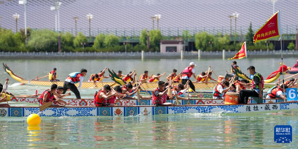 当日,2025年西藏自治区端午节牛皮船(龙舟)赛在拉萨滨河公园水域举行。来自全国各地的160名选手组成的10支龙舟队伍和20支牛皮船队伍同在高原竞渡,吸引众多观众到场观看。