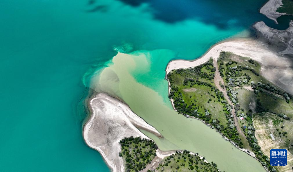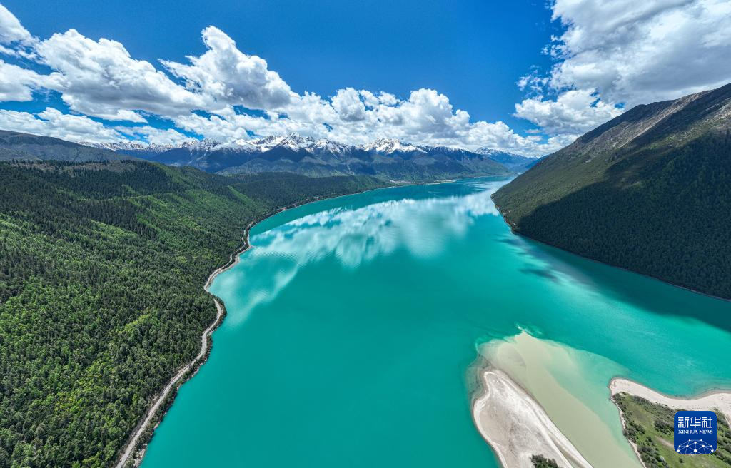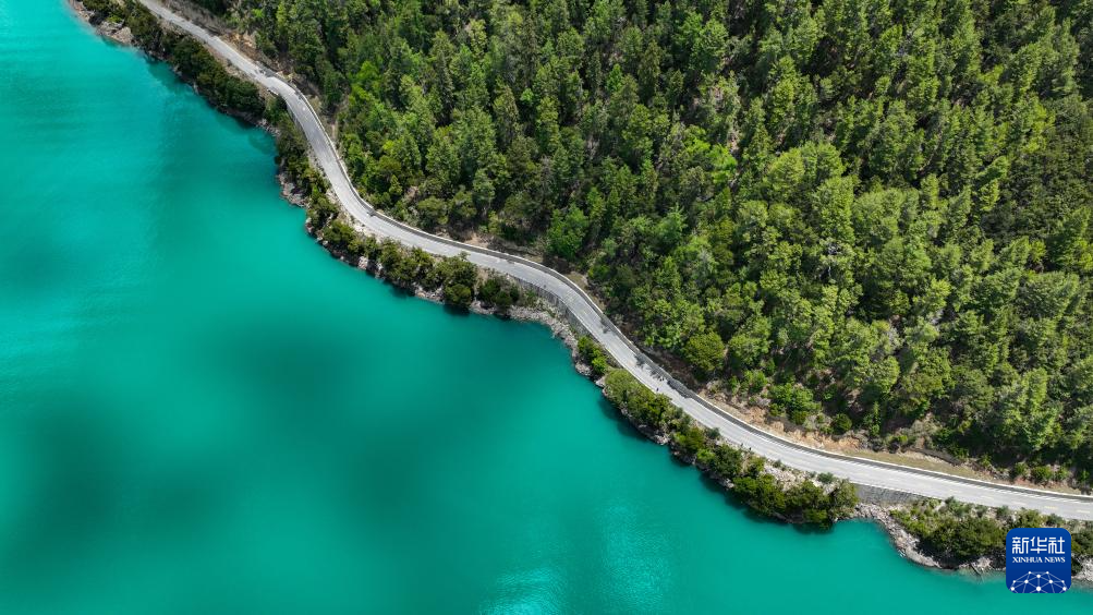 巴松措岸边蜿蜒的公路(5月28日摄,无人机照片)。新华社记者 晋美多吉 摄