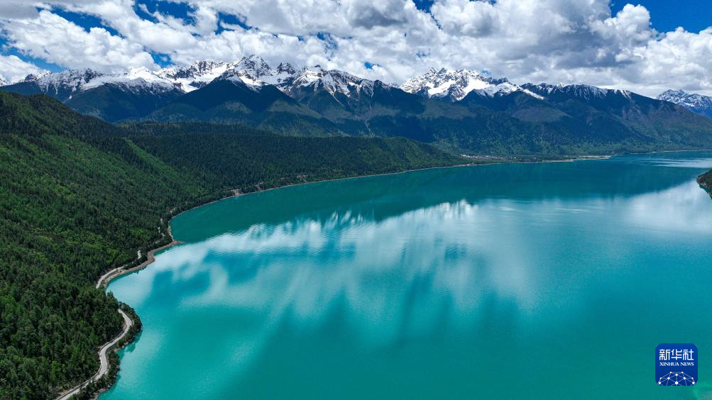 雪山环抱的巴松措(5月28日摄,无人机照片)。新华社记者 晋美多吉 摄