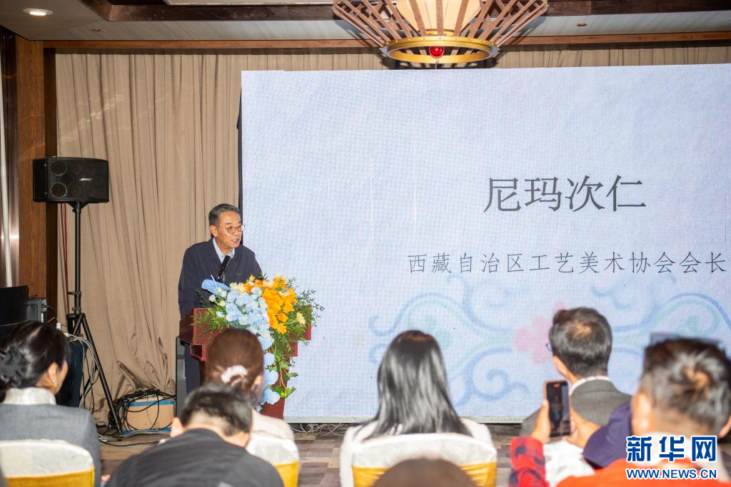 7月7日,西藏自治区工艺美术协会会长尼玛次仁在活动现场交流发言。新华网 旦增努布 摄