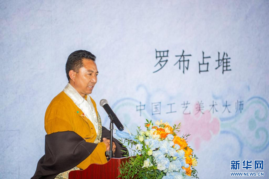 7月7日,中国工艺美术大师罗布占堆在活动现场交流发言。新华网 旦增努布 摄