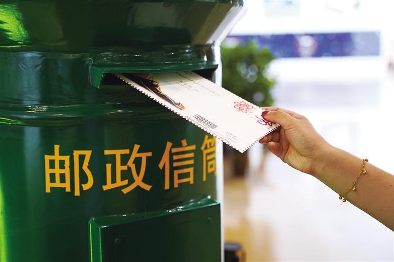 游客正在邮政服务点选购、寄出明信片。