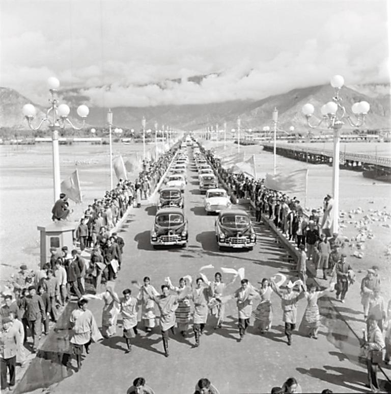 1965年拉萨大桥建成通行时的场景(资料图片)。