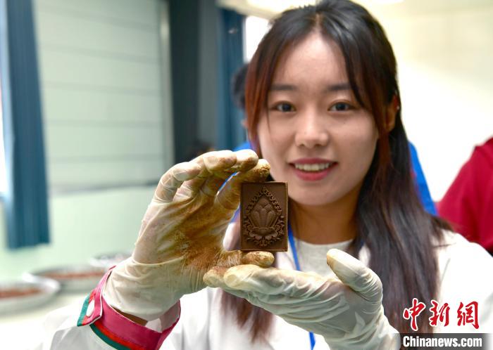 7月13日,西藏昌都市昌都经济开发区的厂房里,现代化设备和非遗手工制作的藏香整齐摆放。作为昌都市藏药生产龙头企业,西藏仙露藏药有限公司大力研发生产藏香产品,让更多民众在家门口就业,带动民众增收致富。图为员工展示藏香牌。中新社记者 李林 摄
