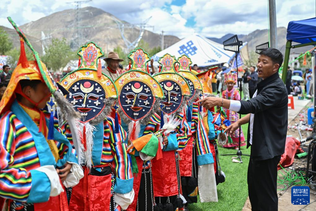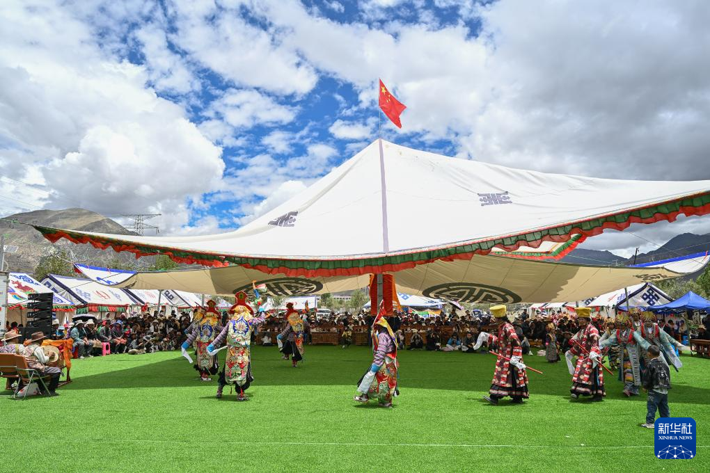 7月16日,民间藏戏表演队在南木林县非遗公园内表演湘巴藏戏。新华社记者 李鑫 摄
