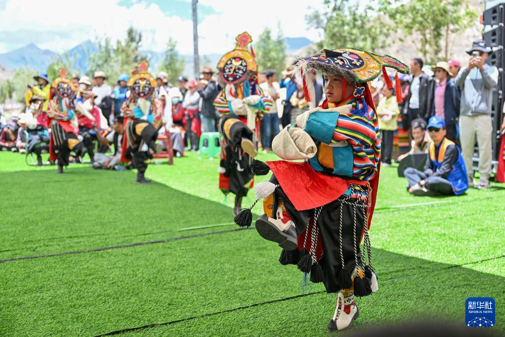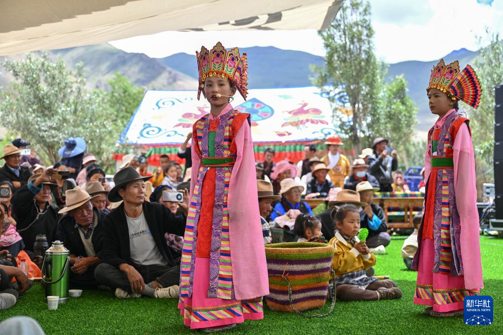 7月16日,果拉村少儿藏戏队的小演员在南木林县非遗公园内表演湘巴藏戏。新华社记者 李鑫 摄