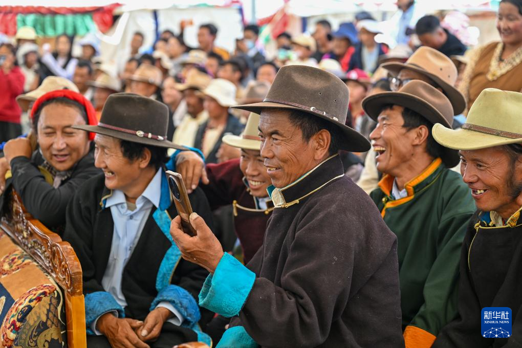 7月16日,群众在南木林县非遗公园内观看藏戏表演。新华社记者 李鑫 摄