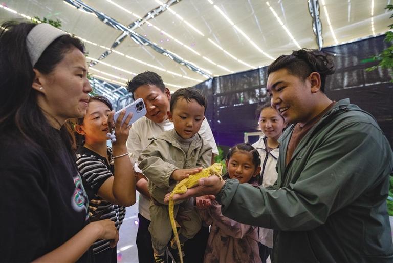 扎囊县西普休闲观光农业发展有限公司建设的海洋馆内小孩正在与蜥蜴互动。