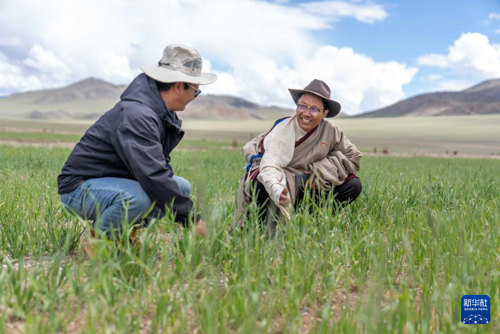 7月20日,文布当桑乡乡长拉巴欧珠(左)和夏玛村党支部书记努桑在看草的长势。新华社记者 旦增尼玛曲珠 摄